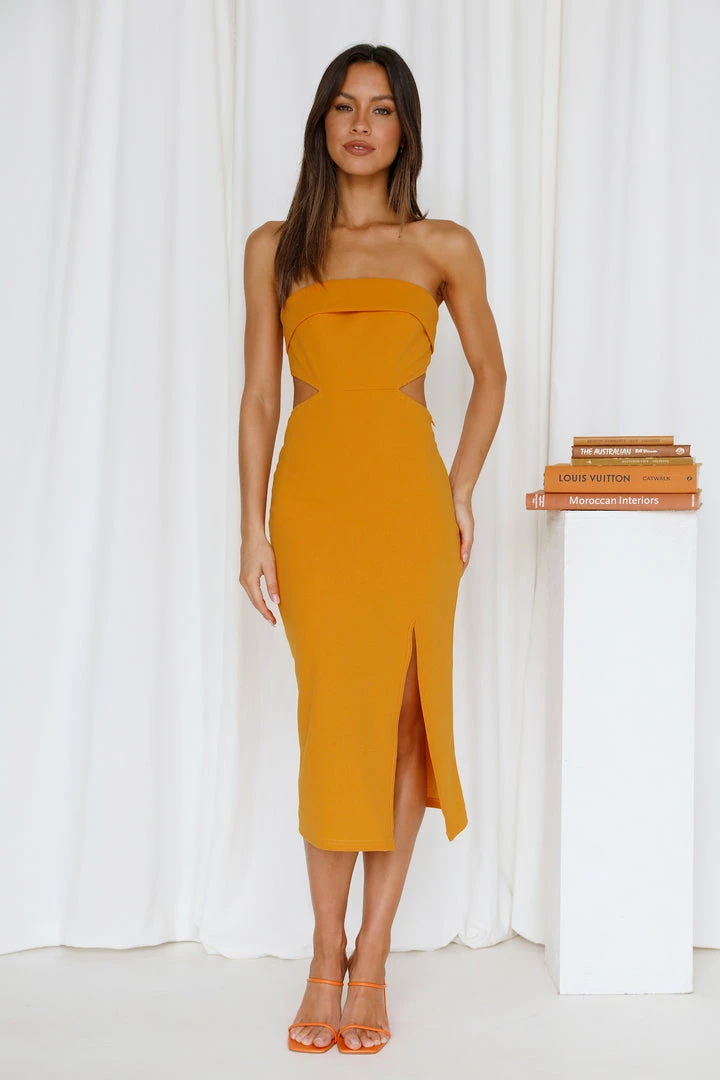 Only Strut when you’re slaying in a midi this hot and iconic girl! Featuring a strapless design, with a foldover detail, waist cut-outs, an open back and a fitted skirt with a side slit. Style yours with heels and a bold lip.