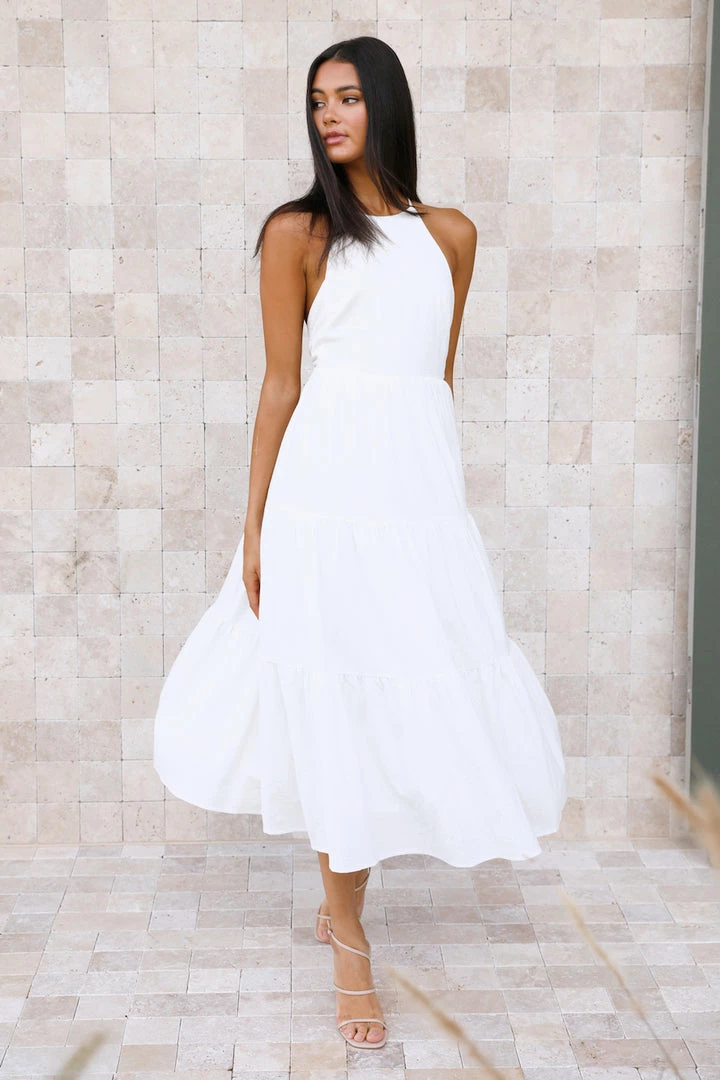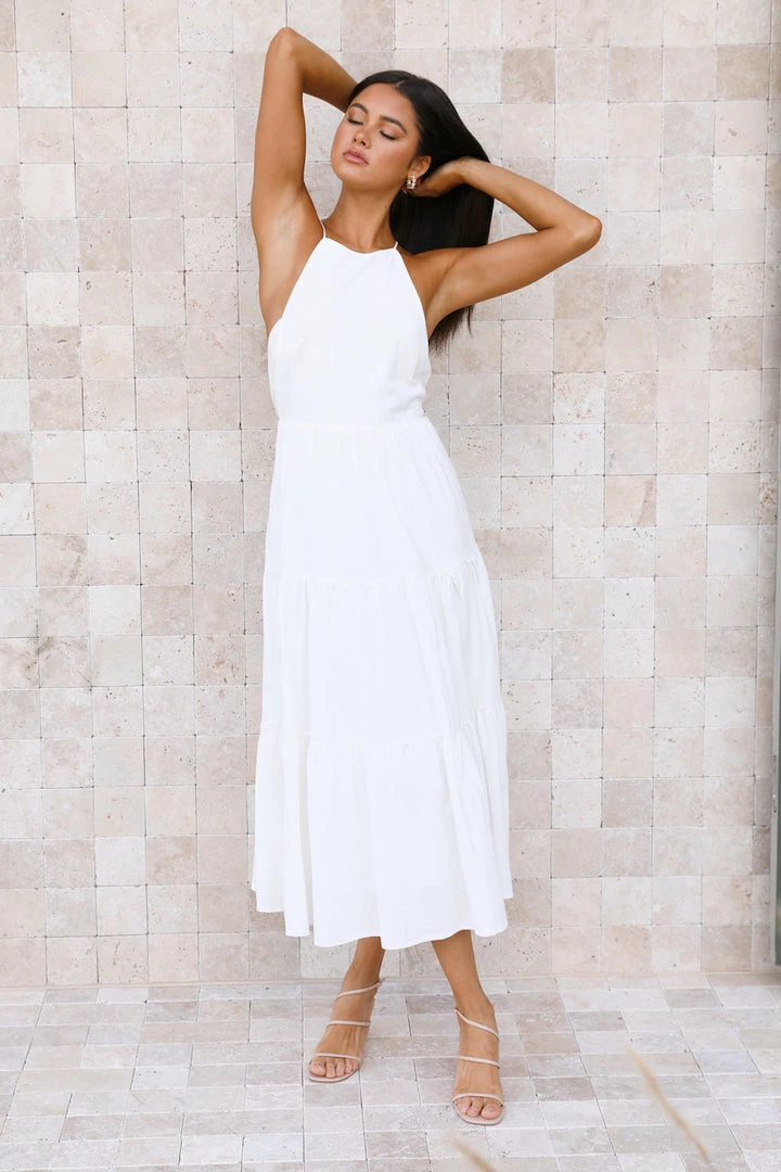 Walks by the beach are COVERED with this signature maxi. The Rosey Cheeks Maxi features a high neck, with a lace-up back, an open back and a long + flowy skirt. Style yours with small heels and a messy bun.ย