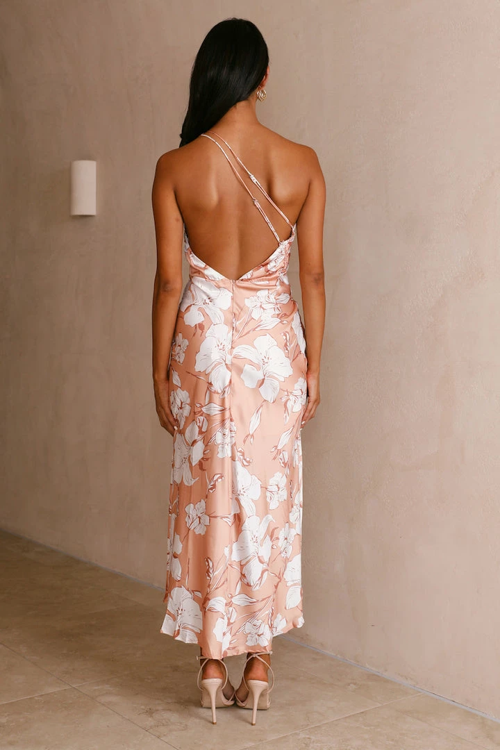 Treat Yourself 24/7 girl! This midi features a slashed neckline with an open back, ruching and a dramatic side slit. Style yours with waves and mules.Β