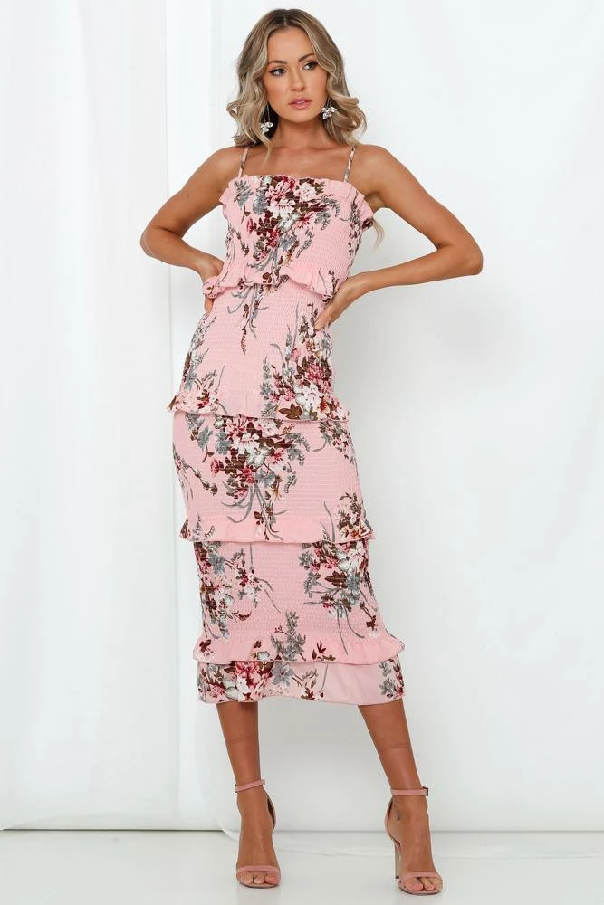 - Pink print midi dress.