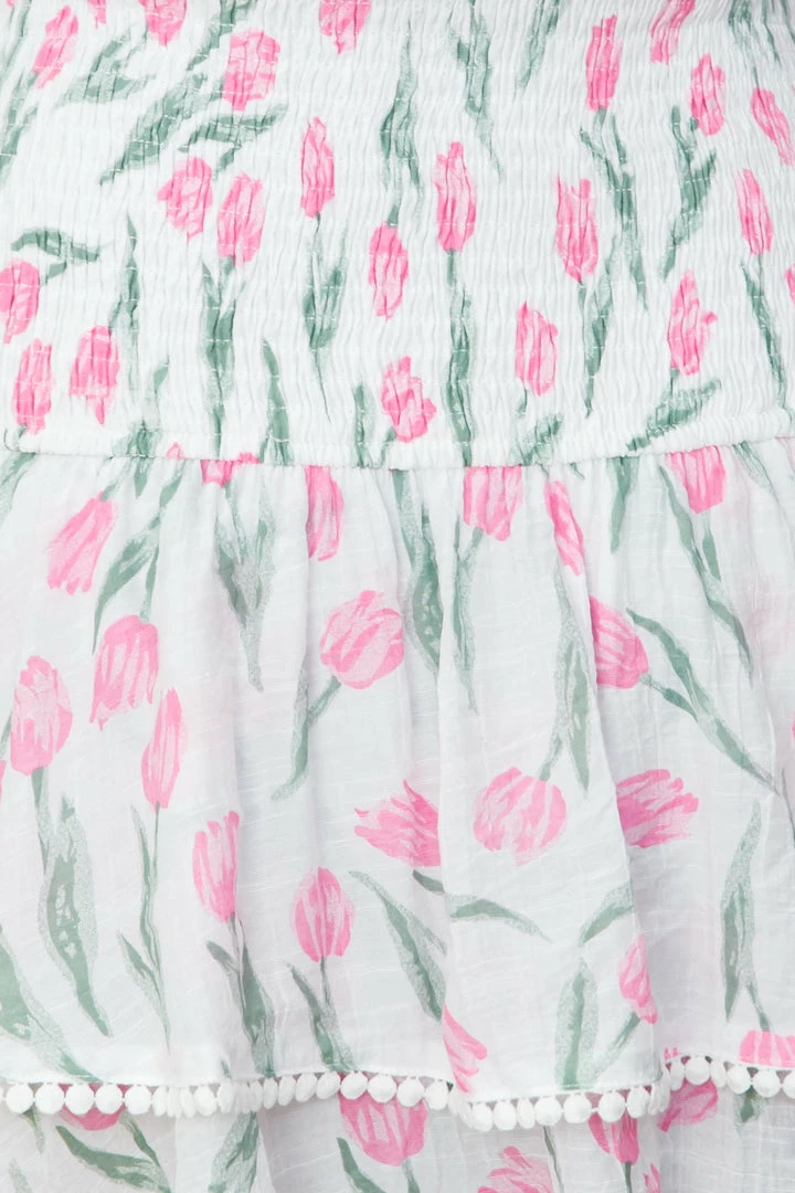 - Pink print mini dress.