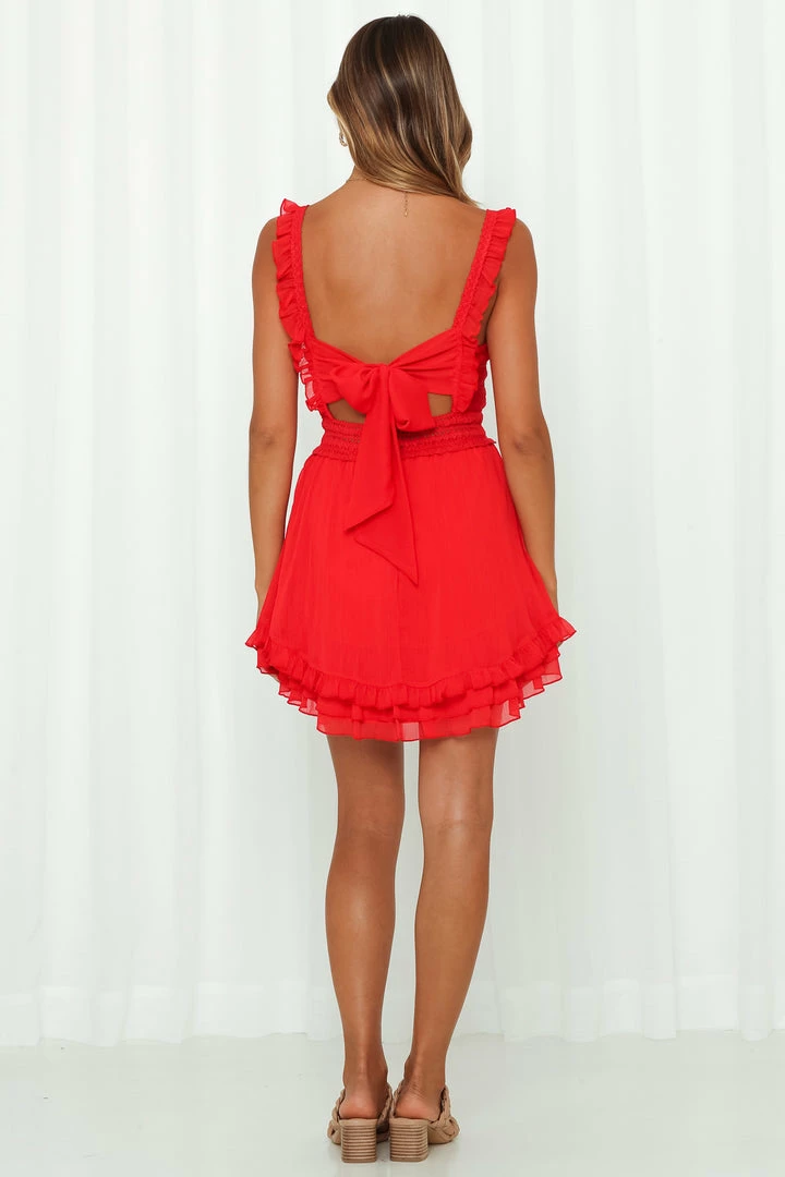 This transitional essential will ensure you remain in the limelight 24/7. Trimmed with crochet lace inserts, this feminine and flirty fit-and-flare mini dress features ruffled short sleeves, a matching ruffle hemline and a square v-neckline. The real point of focus is the back with its tie up bow design!