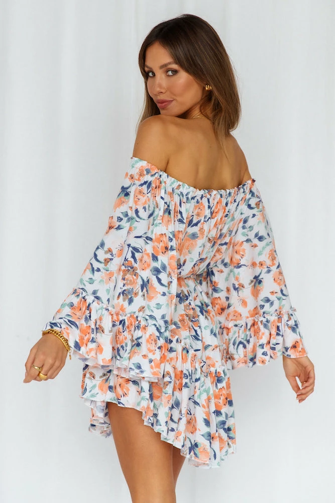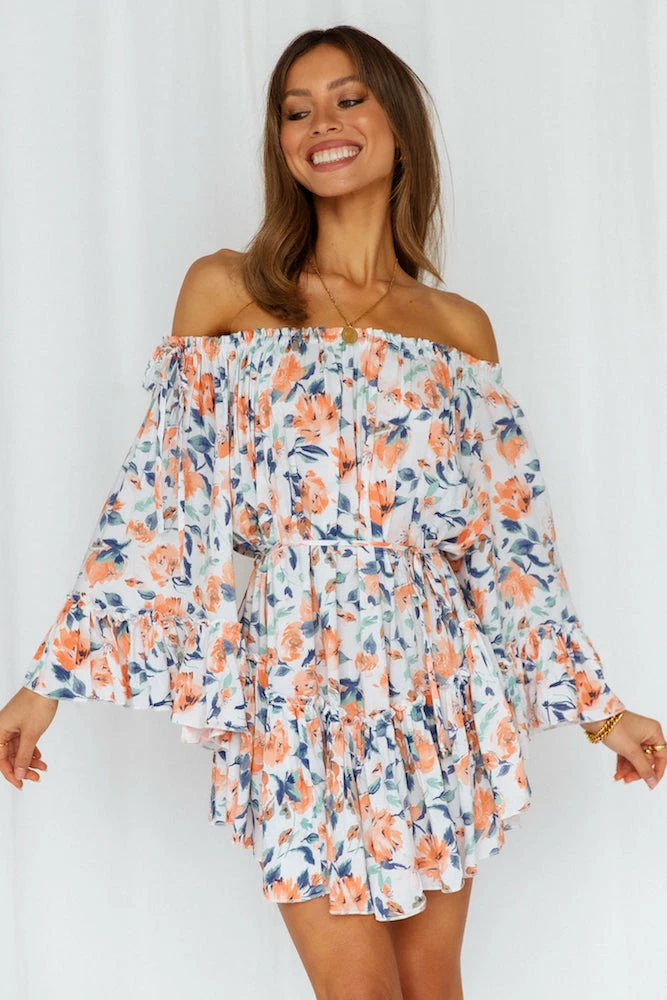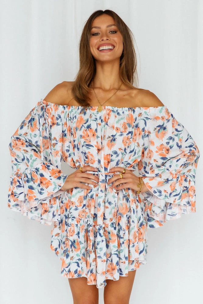 We Love The Way this is making you look, so cute! This mini has a unique billowy silhouette with waist-ties so you can be PEAK boho chic. Along with flowy short sleeves and the off the shoulder neckline – you’ll be adorable all day long! Style yours with strappy heels and small pearl earrings.
