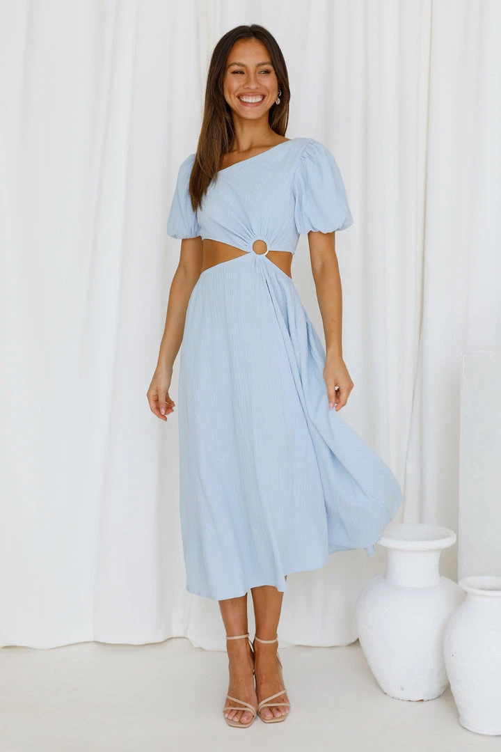 It’s time to get some Vitamin D with this sweetie by your side. The Daylight Finding Midi features a slashed neckline, short puffy sleeves, a dramatic midriff with a ring detail, an open back and a flowy skirt. Style yours with sandals and waves.ย