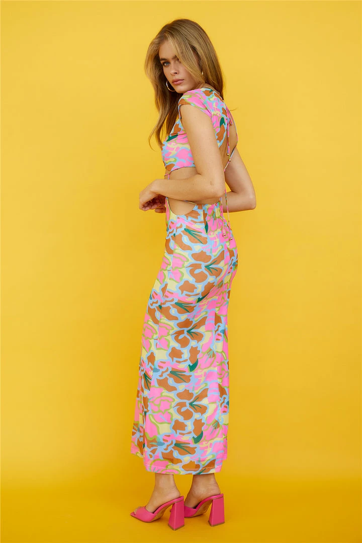 The 70’s is calling and you’re going to get that Groovy Feeling in this ultra-fun Midi Dress. This piece features short sleeves, underbust ruching, open back, waist cutout and a long midi length skirt. WhetherΒ you‘reΒ attendingΒ aΒ summertimeΒ partyΒ orΒ drinks,Β thisΒ dressΒ isΒ sureΒ toΒ turnΒ heads! Style yours with heels and an updo.Β