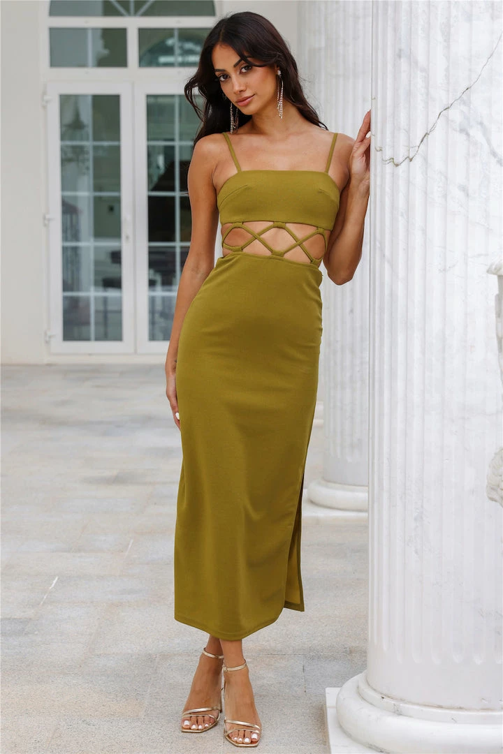 Time to cha-cha move into the Highway Slide with this chill-vibed midi. Featuring a straight neckline with a unique waist cut-out detail, an open back and a side slit. Style yours with mules and waves.Β