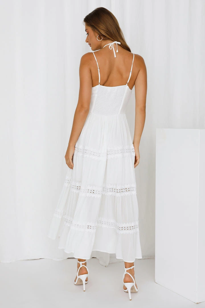 Frolic through the meadows and the Sweeping Skies with this boho-chic midi. Featuring a sweetheart neckline with a tie-up detail and a tiered skirt with lace features. Style yours with mules and waves.
