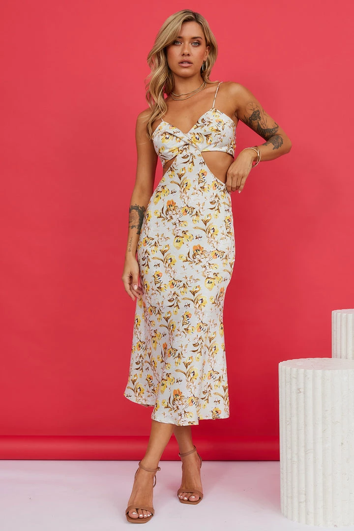 Embrace your title as the Mimosa Queen in this luxe midi. Featuring a subtle sweetheart neckline with a dramatic midriff, an open back with a tie detail and a long flowy skirt. Style yours with strappy heels and waves.ย