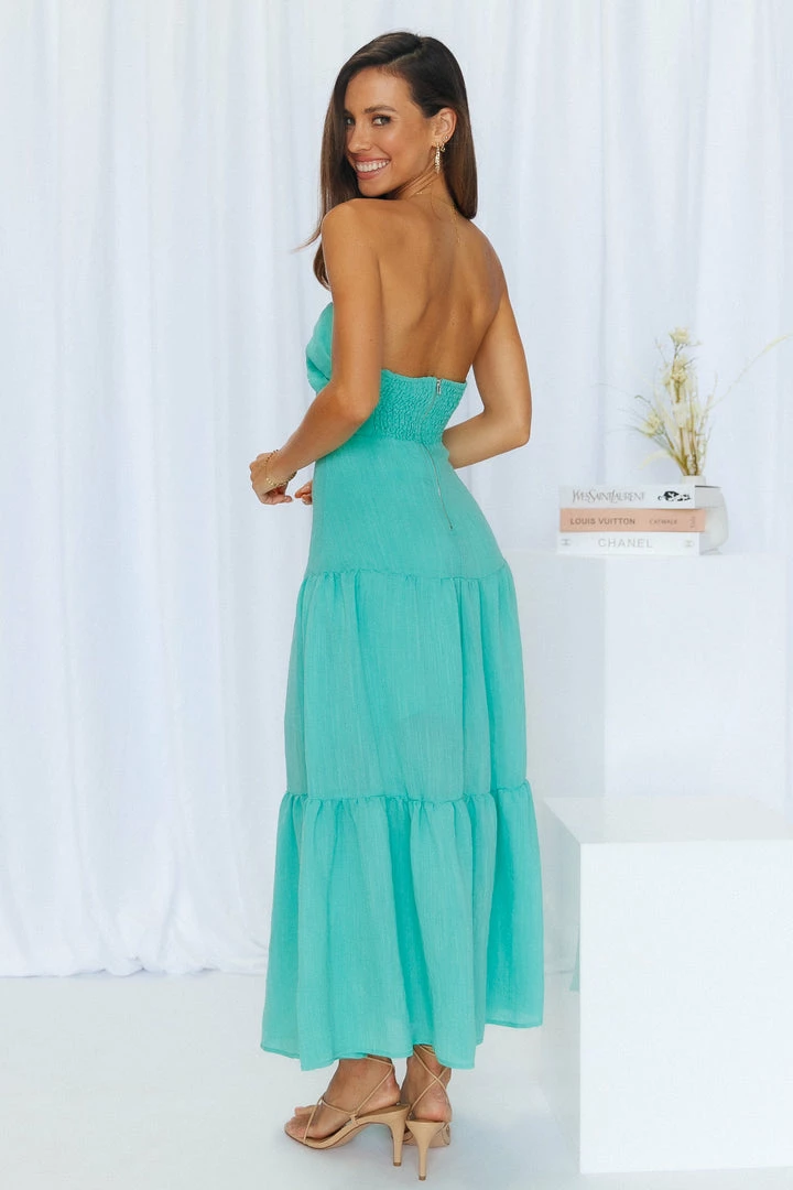 Be sure to Pose For The Show in this adorable midi. This dress will have you feeling yourself all throughout the sunny days. Featuring a strapless design, a front cut-out with a twist detail, an open back and a flowy skirt. Style yours with strappy heels and a cute cross-body.ย
