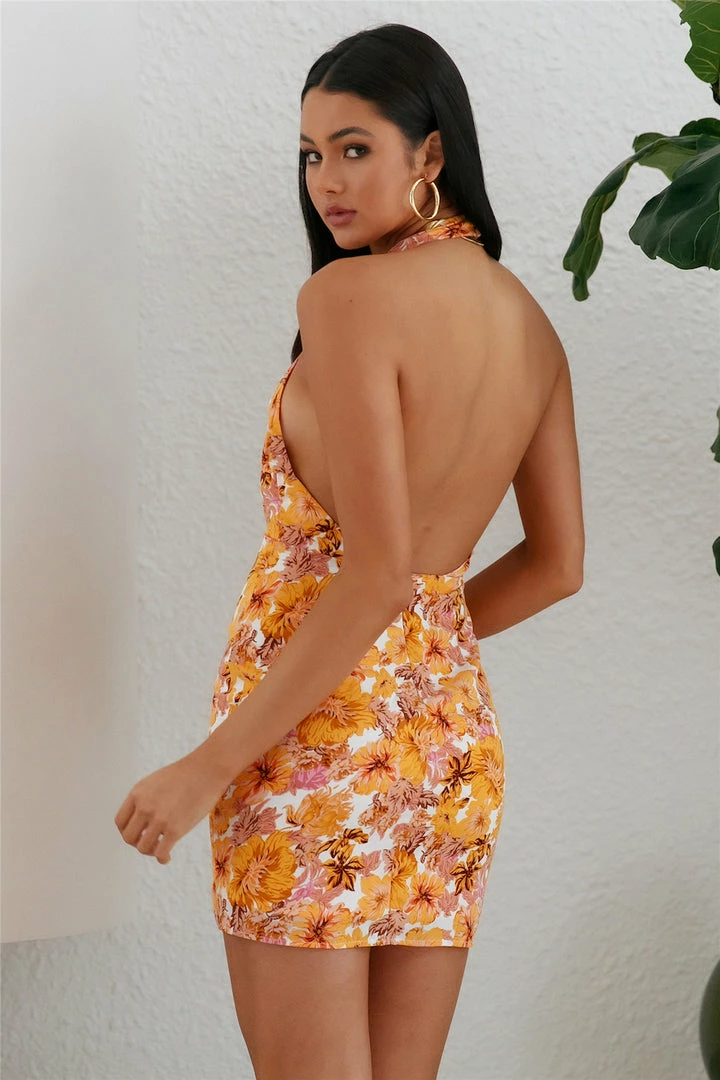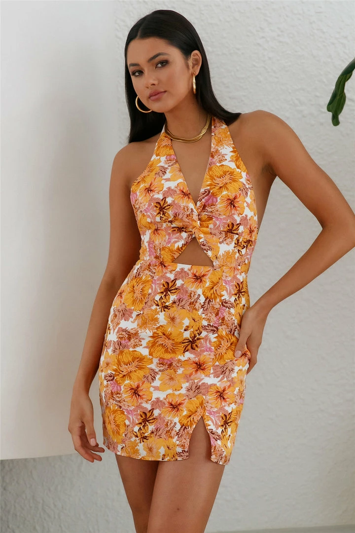 This delicious little number is sure to get you noticed. The flattering halter neckline and mini length make it the perfect dress for a night out on the town or for your Small Escape. Featuring a GORG floral print, a front cut-out and a super open back. Style yours with mules and waves.Β