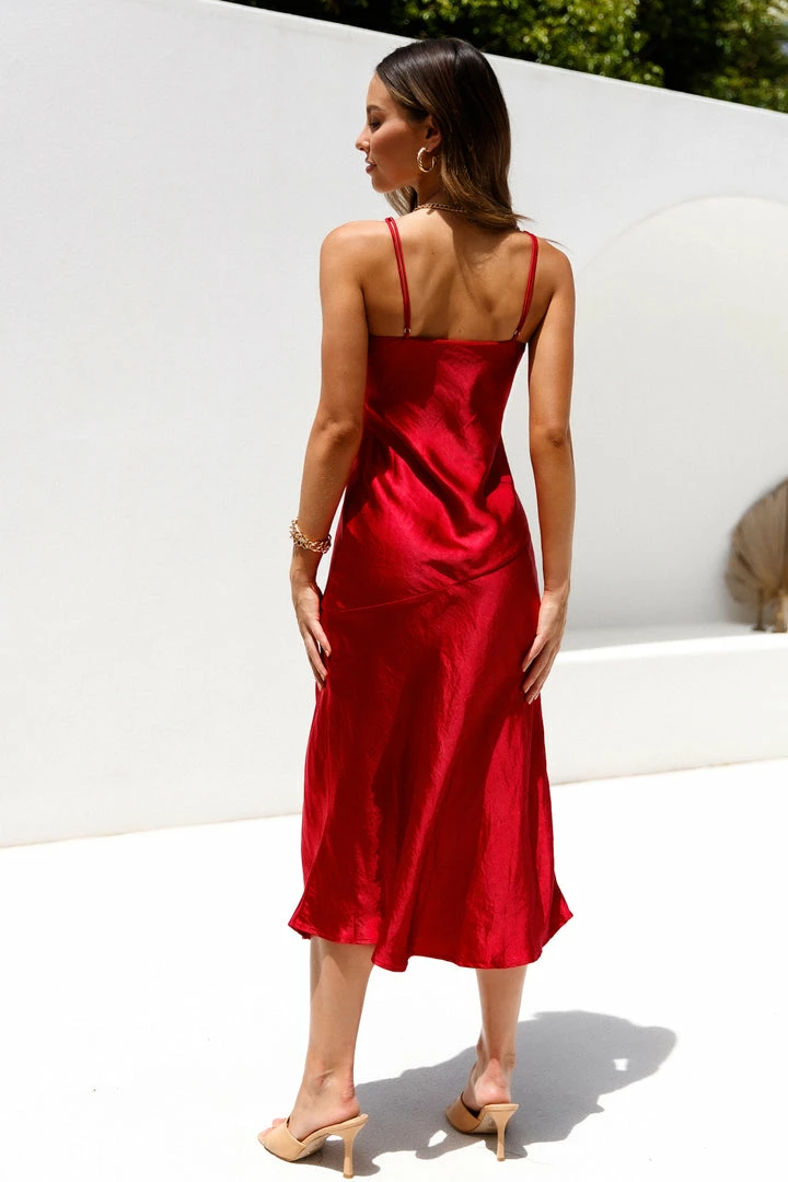 Experience all your elegant dreams in our Wanted On The Dance Floor Midi Dress! Made of lush satin, your next date night dress features a lush, scooped neckline with pleat detailing and a slightly asymmetrical hemline! We’re styling ours with matching stiletto heels, tousled waves, and sparkling chandelier earrings.